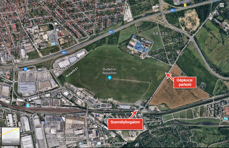 - Akik Budaörs ( Tesco ) irányából érkeznek, a Mol körforgalmat egyenesen elhagyva tovább kell menniük a repülőtér mögött vezető úton, balra kanyarodó utat követve rá kell térniük a Kőérberki útra. A kanyartól kb. 200 m-re, bal kéz felé esik majd a kialakított parkoló, ahonnan be lehet sétálni a körépület elé.