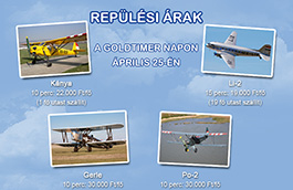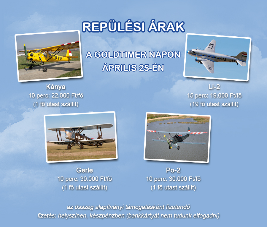 (Kiegészítő információ kisgépes repüléshez: Elnézésüket kérjük, de 15' és 20' perces kisgépes (Po-2, Gerle, Kánya) repülésnél nem tudjuk biztosítani a szabadon választható időpontot, mert ennyi repült időért nem rentábilis lemotorozni a gépeket. A választható dátumokról az info [kukac] goldtimer.hu e-mail címen tudnak tájékoztatást kérni.)
